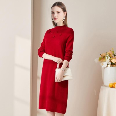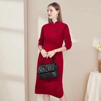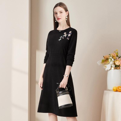 Autumn and winter new cashmere ladies elegant embroidered round neck waist knit dress