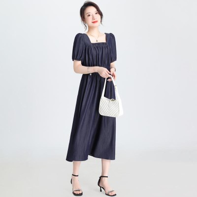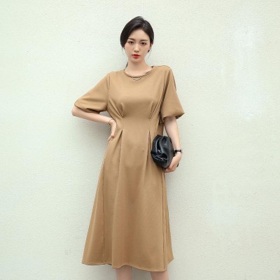 Women's elegant round neck pleated loose waist foam sleeve sleeve dress